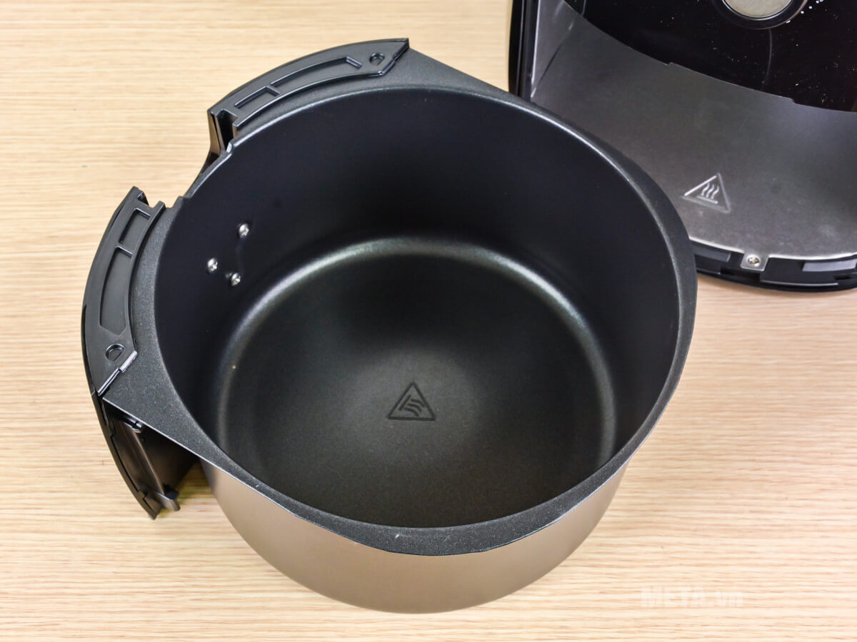 Lòng nồi làm từ kim loại phủ sơn tĩnh điện chống dính tốt, hạn chế thực phẩm bám dính vào khay chiên, giúp đảo mặt dễ hơn, vệ sinh lòng nồi nhanh chóng.