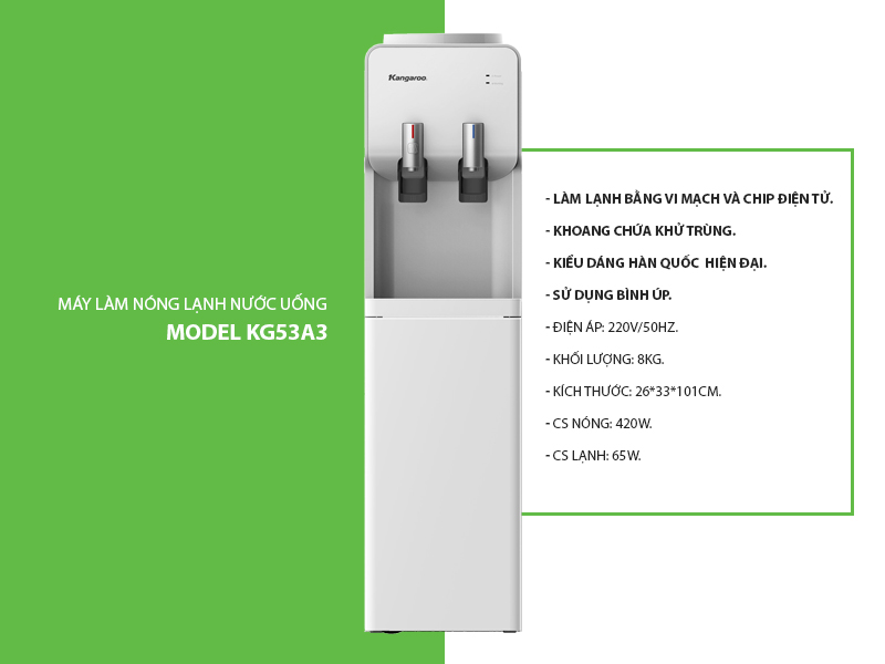 Máy làm nóng lạnh nước uống Kangaroo KG53A3 được thiết kế hiện đại, nhỏ gọn, phù hợp đặt ở mọi vị trí khác nhau. Máy làm nóng lạnh nước uống của Kangaroo đa năng 2 trong 1 với chức năng vừa làm lạnh nước, vừa làm nóng nước luôn tại vòi.